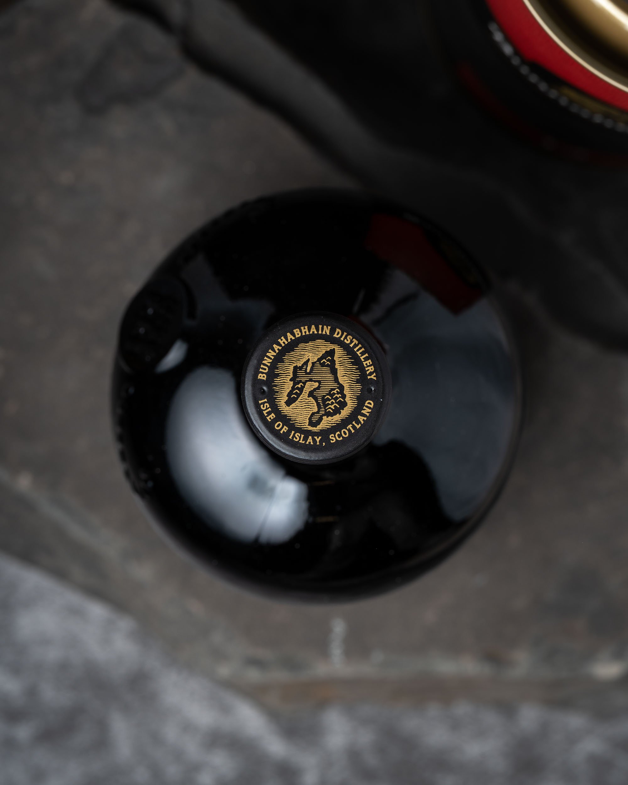 The Bunnahabhain bottle shares that short, sturdy profile I've come to appreciate in bottles like Aberlour and Balvenie. It feels solid and well-weighted in the hand. What sets it apart, though, is the completely opaque black glass — you can't see the whisky inside at all. It's a bold design choice that I'm not entirely sure about. Part of the joy of whisky is admiring that natural colour, and here you're left guessing until you pour. The label is clean and simple, with that distinctive Bunnahabhain typography doing most of the work. It's certainly striking on the shelf, but I do miss being able to see what's inside (especially to know how much is left!).